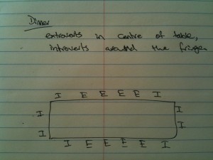 One final takeaway, when you are setting a dinner table keep the extroverts in the middle and put the introverts around the fringes. That way the introverts can tune in and out as they please and will not get too drained by sitting, for instance, between two extroverts.