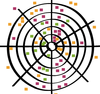 - The circles represent time periods. In this case each circle represents a 3 month timeboxed feature release. The inner circle is the current release, and then there are four future releases in the planning stage.
