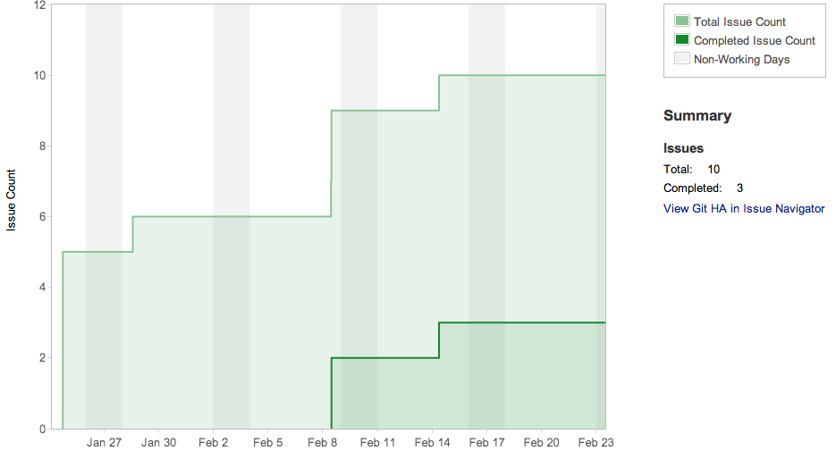 I'm still trying to figure out if I need an In Progress column. Perhaps Epics are only in two states: To Do, and then Done. If you have any thoughts please share them in the comments below. Of course, to get the cycle time I may need to keep this and do something with the workflow in JIRA to push the Epic into In Progress when we start working on the first issue linked to that Epic... more on this in the future.Finally next thing is highlighting the Epic Reports (another great feature that GreenHopper gives product owners, and which can help the management team). Here is an example from one of those epics on the board above: